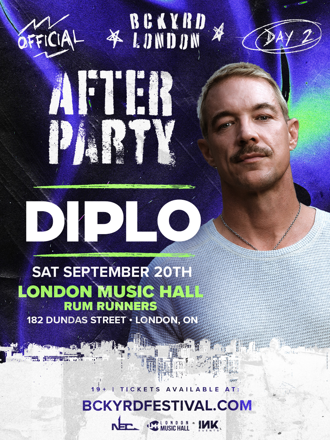 This September, BCKYRD London Festival transforms Harris Park into Southwest Ontario’s ultimate open-air dancefloor. On Sept 19–20, fans will experience electrifying performances from Diplo, Knock2, Malaa, Sidepiece and more, plus a lineup of official after parties that carry the festival into the night.